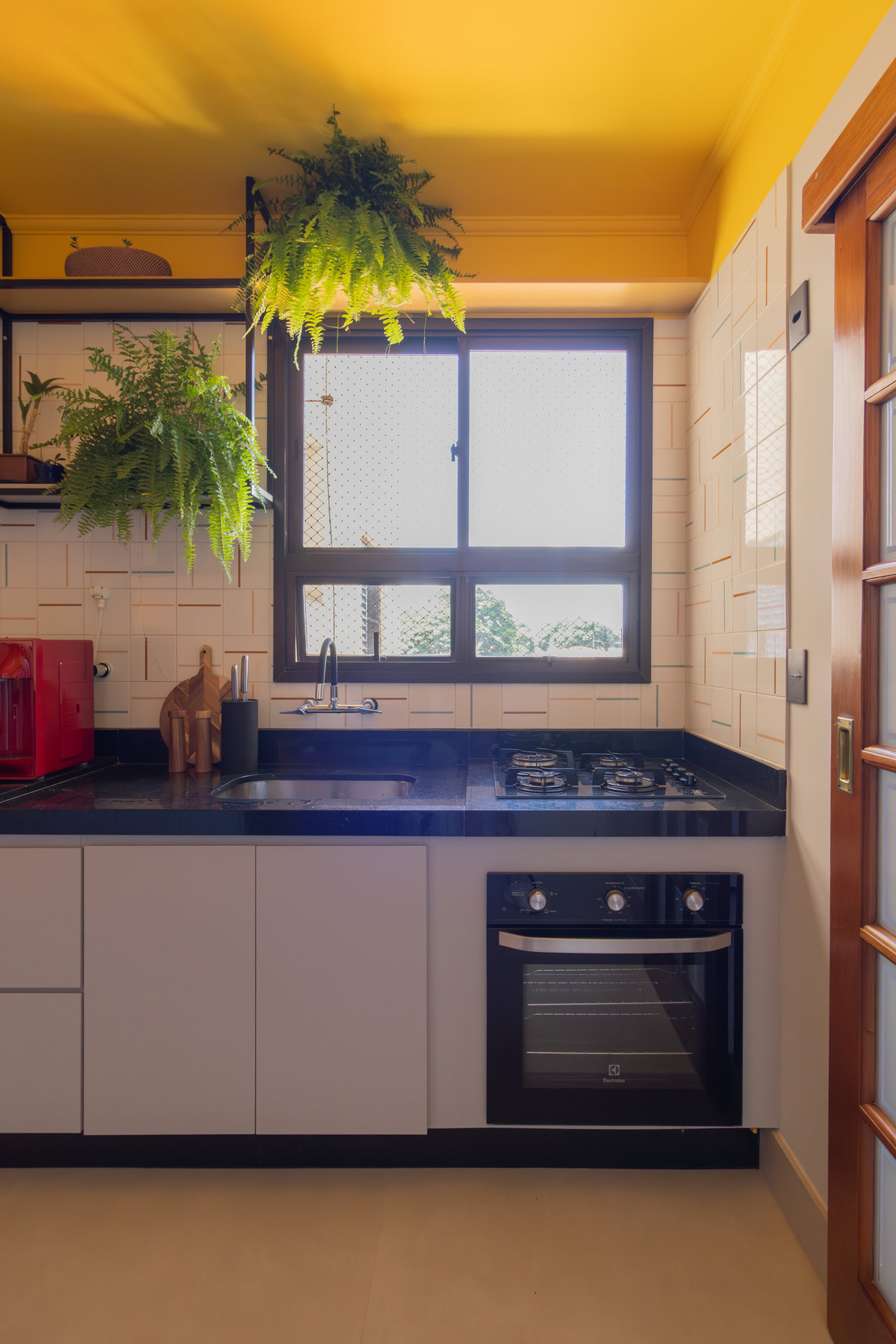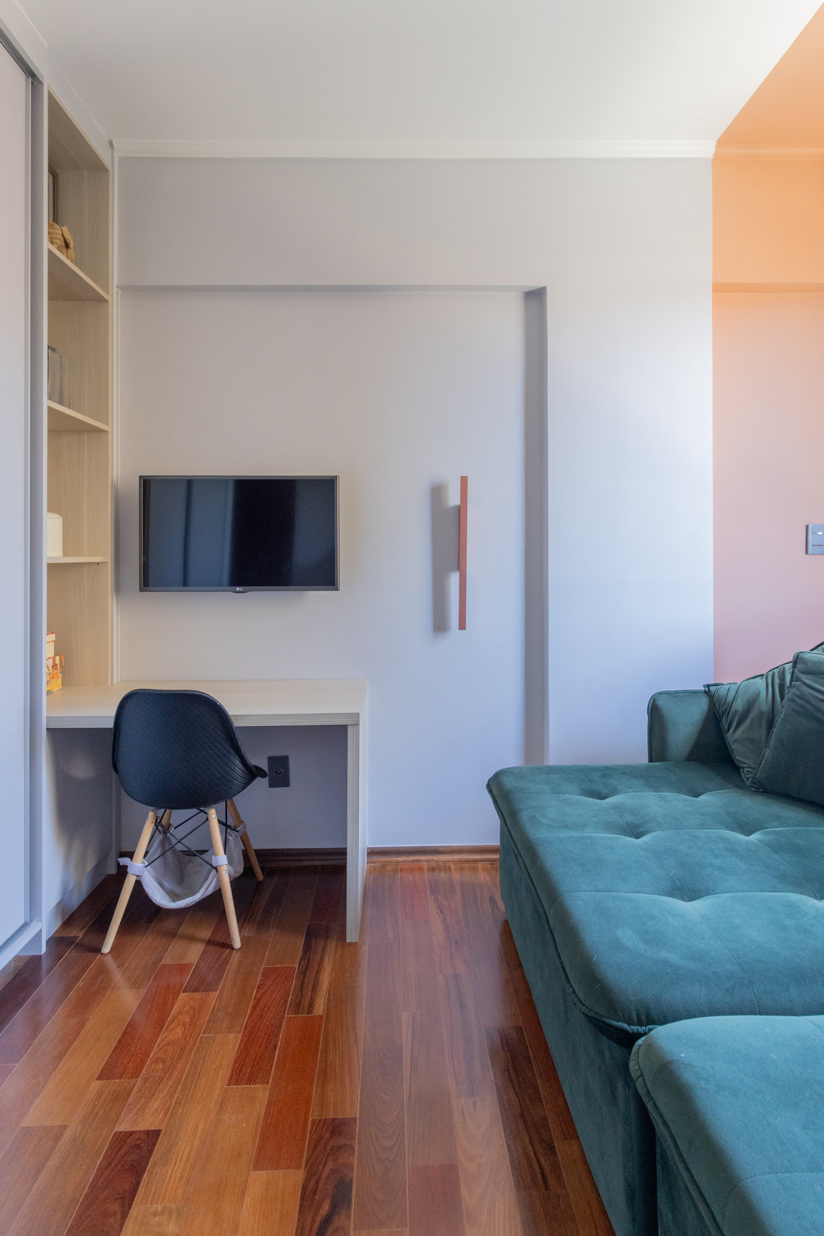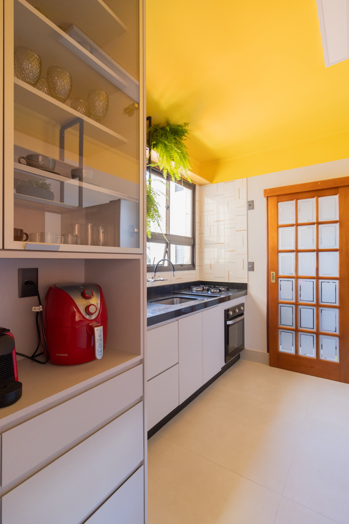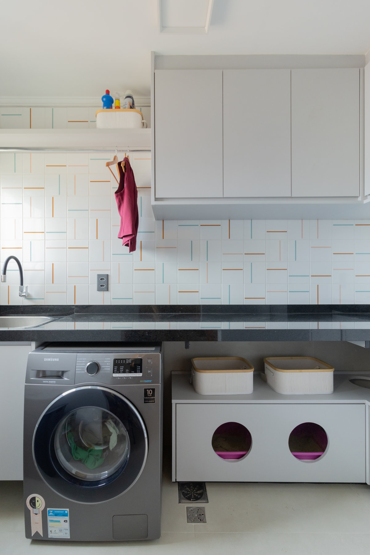 O resultado é um apartamento colorido, alegre e acolhedor — do tipo que abraça quem entra. A marcenaria foi pensada nos mínimos detalhes para garantir funcionalidade, principalmente na lavanderia, onde criamos um cantinho discreto e funcional para o “banheiro” dos gatos. Na cozinha, soluções práticas se uniram ao charme dos acabamentos.