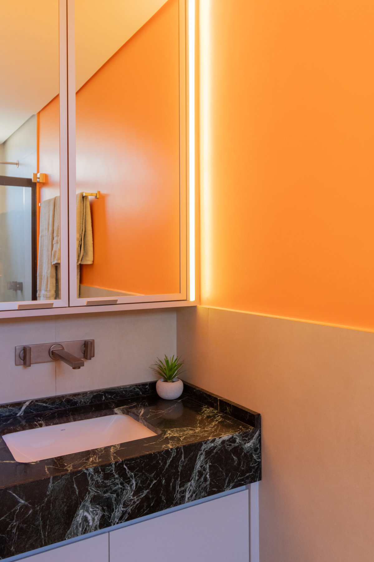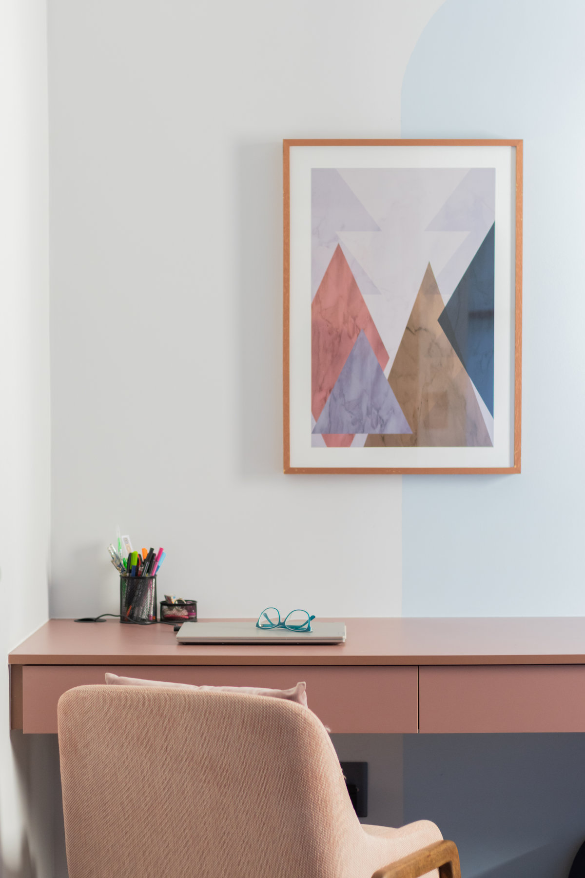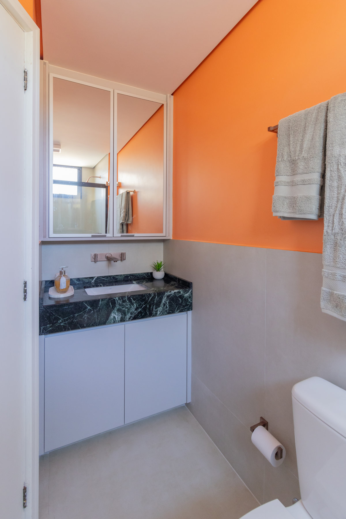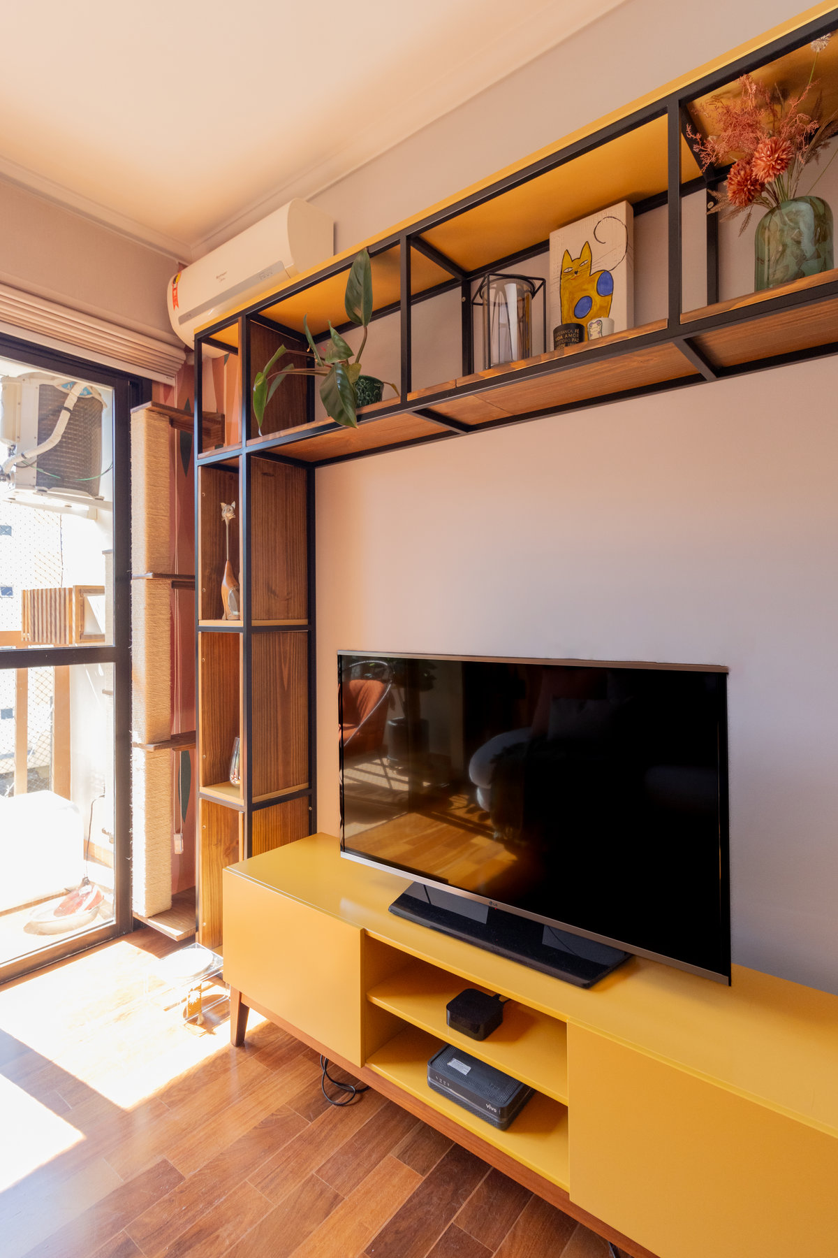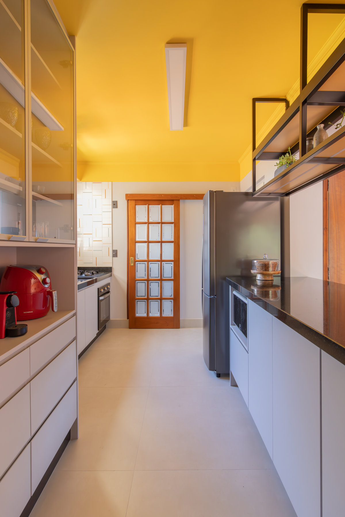 O resultado é um apartamento colorido, alegre e acolhedor — do tipo que abraça quem entra. A marcenaria foi pensada nos mínimos detalhes para garantir funcionalidade, principalmente na lavanderia, onde criamos um cantinho discreto e funcional para o “banheiro” dos gatos. Na cozinha, soluções práticas se uniram ao charme dos acabamentos.